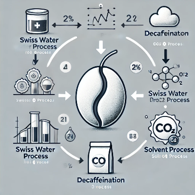 - 에틸 아세테이트(과일에서 추출) 또는 메틸렌 클로라이드(화학 용매)를 이용해 카페인을 제거하는 방식