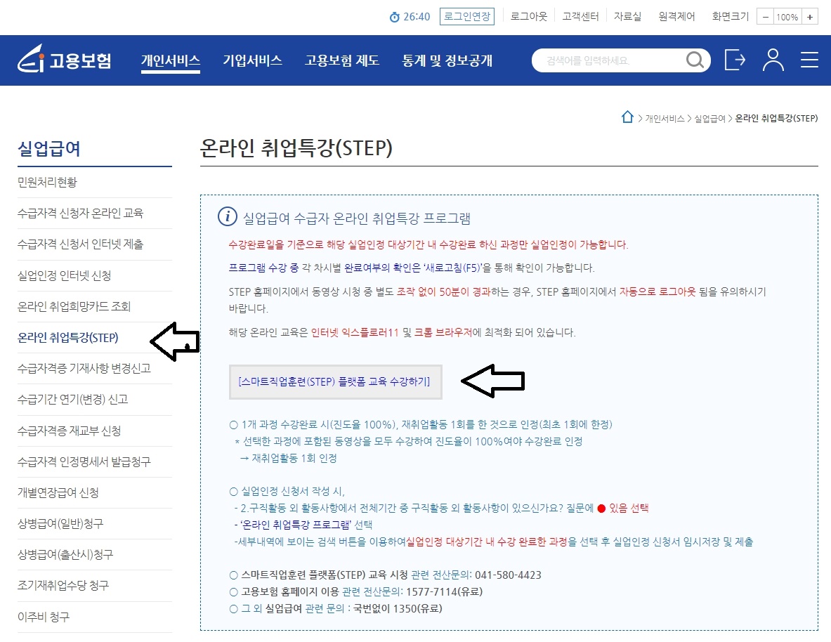 실업급여를 받을시 온라인 취업특강(STEP) 를 수강하고 실업인정을 받을시 인터넷 신청을 하는 절차입니다.