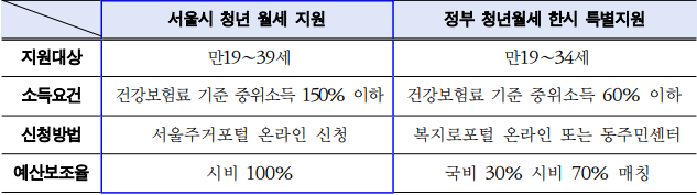 서울시 사업은 만 19세~34세, 기준 중위소득 60% 이하 청년만이 지원 가능한 정부 청년월세 한시 특별지원 사업에 비해 만 19세~39세 기준 중위소득 150% 이하의 청년도 지원할 수 있어 보다 광범위한 청년층을 대상으로 한다.