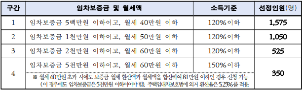 월세 60만 원 초과자 중에서 보증금 월세 환산액(주택임대차보호법에 따라 환산율 5.25% 적용)과 월세액을 합산해 '81만 원 이하'인 경우에는 신청할 수 있다.