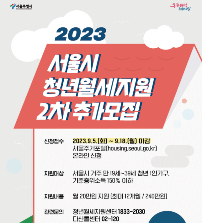 서울시 월 20만 원씩 12개월 지원 '청년월세' 2차 추가모집을 9월 5일(화요일)부터 신청을 받습니다.